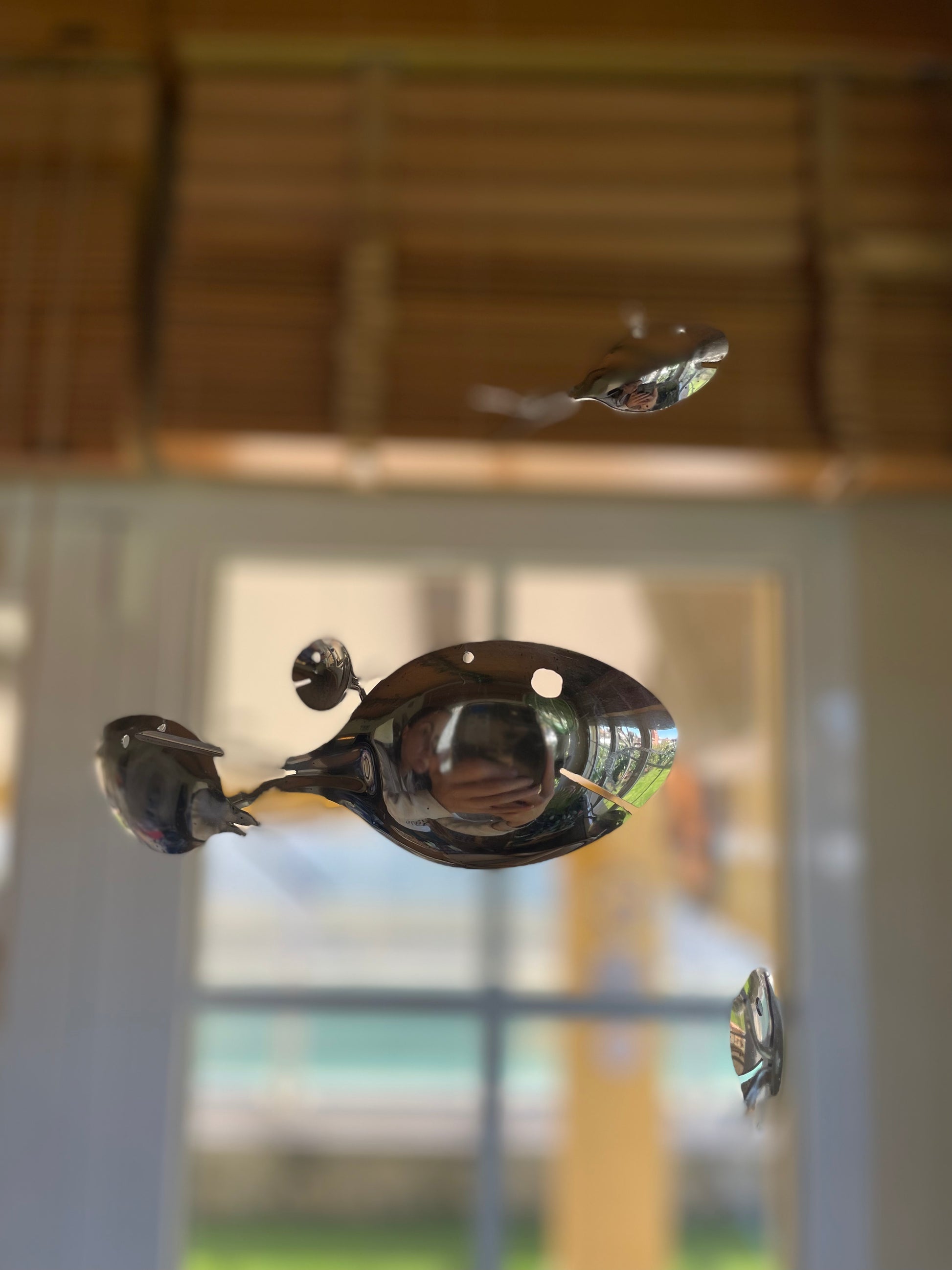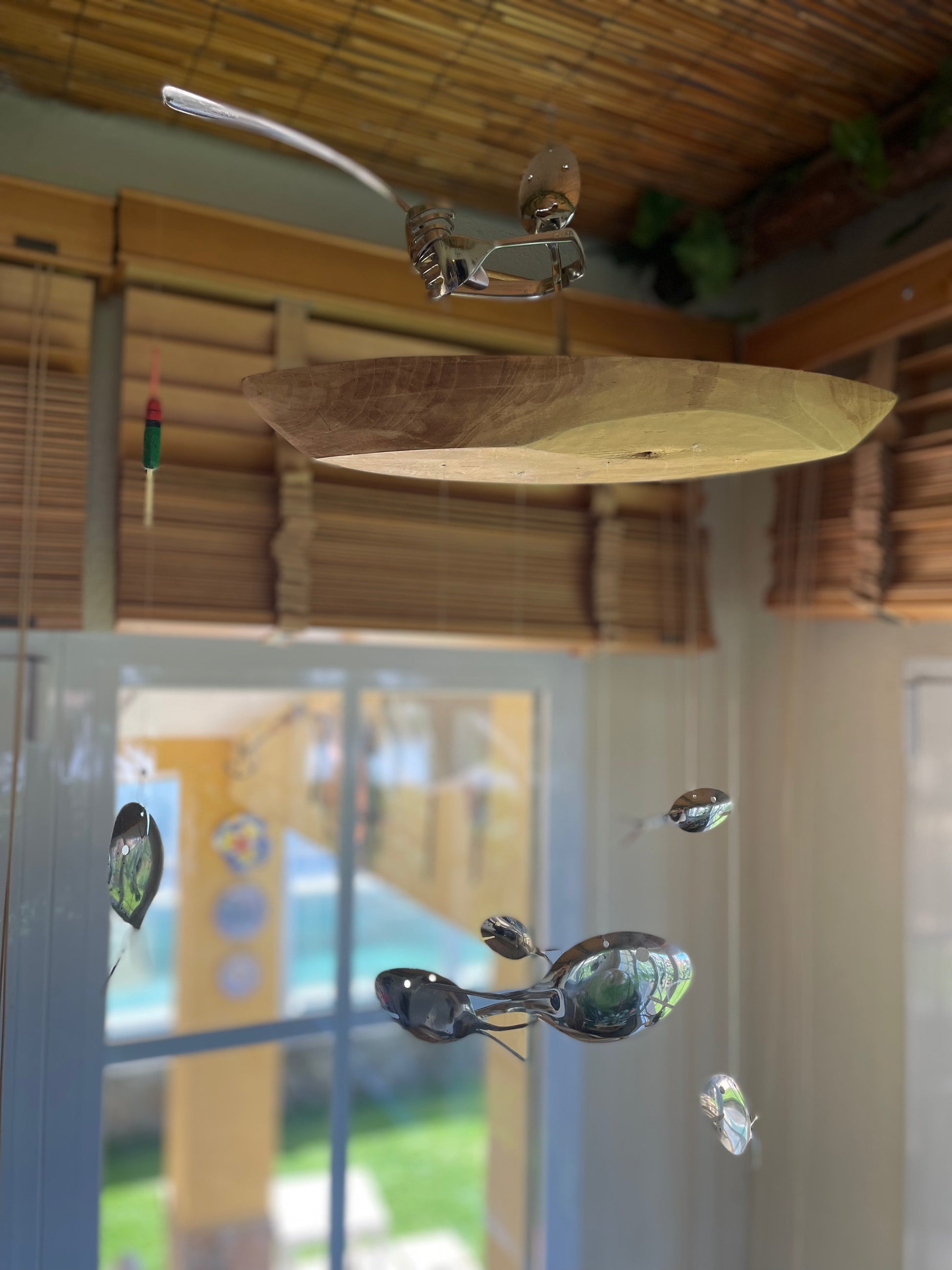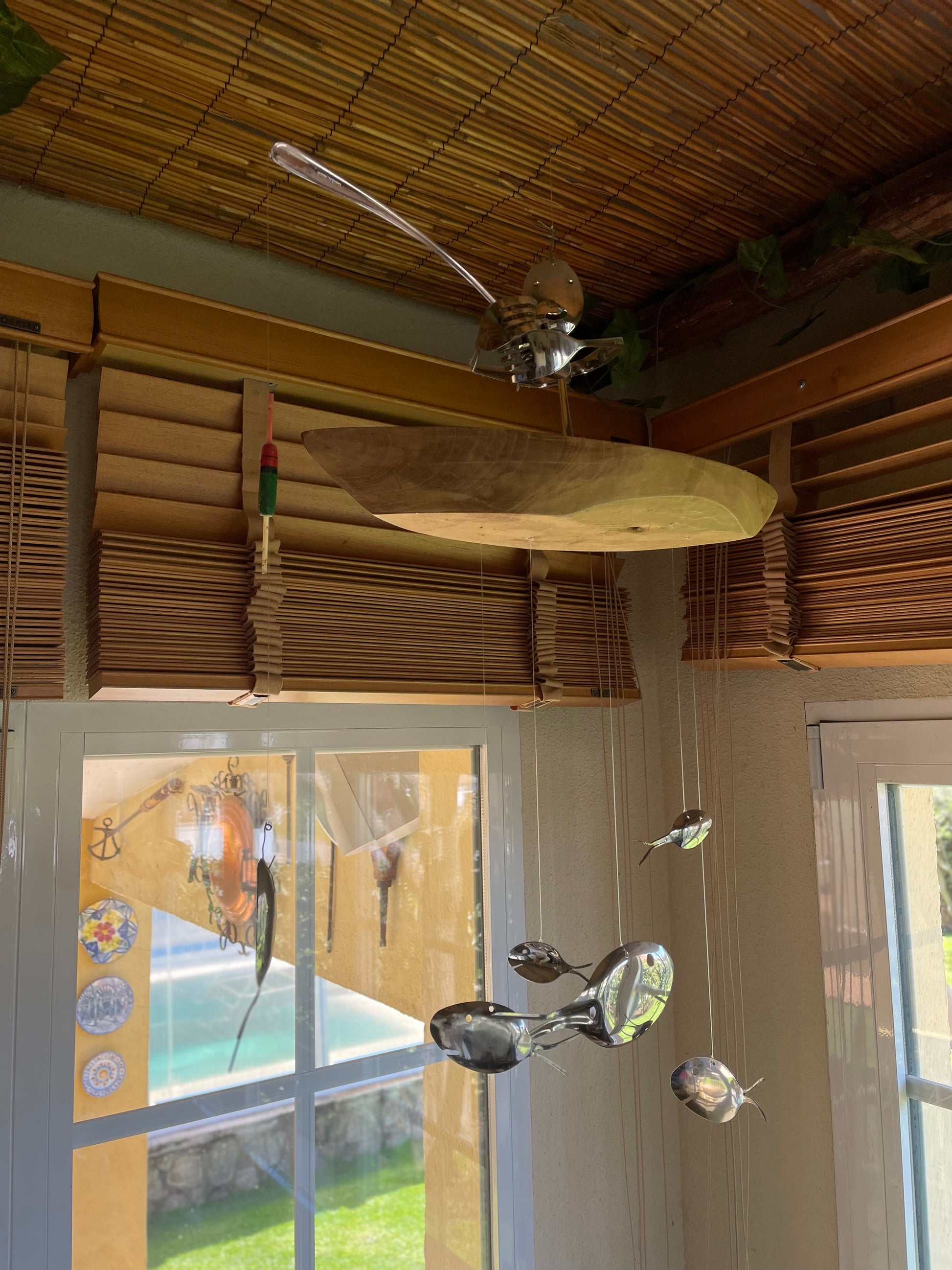 Pieza decorativa hecha a mano en madera natural. Representa una escena sencilla y entrañable: un pequeño barco del que cuelga una caña de pescar con peces. Cada detalle está trabajado con materiales recuperados, respetando las formas y texturas originales de la madera.
